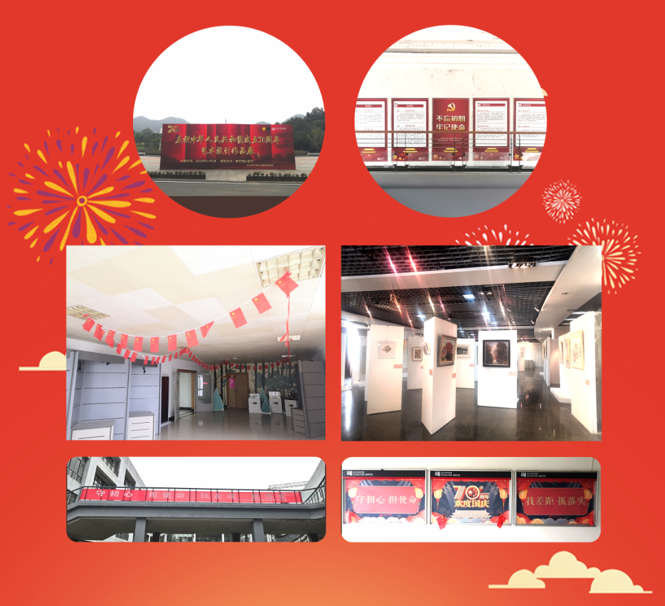 党委开展艺术设计作品展及主题教育环境营造,各党支部结合“不忘初心、牢记使命”主题教育,以多种方式喜迎国庆、祝福祖国。