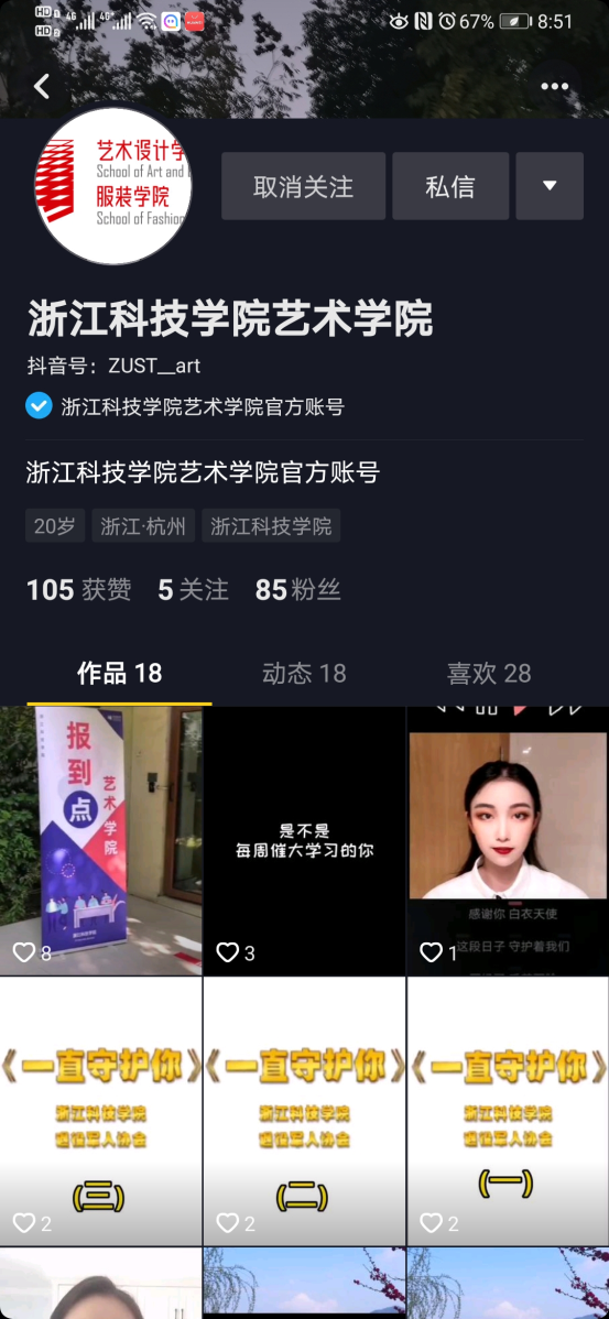 近期,艺术学院团委深入摸底调查发现抖音、快手等短视频APP在学生群体的使用率达40%以上。针对艺术学院动画、摄影、视觉传达等专业特色,艺术学院团委积极组织,创建了一支短视频运营团队,在抖音APP上注册了“浙江科技学院艺术学院”官方抖音账号。 一直以来,艺术学院团委都很重视大学生各方面创新发展,此次创建抖音团队,一方面希望能努力挖掘和培养短视频制作、运营的特色人才,另一方面也是意在通过一个全新的更加广阔的舞台,鼓励同学们通过短视频展现自己,更是能以一种更直接的方式让同学们及时了解到校园动态,丰富同学们的校园生活。