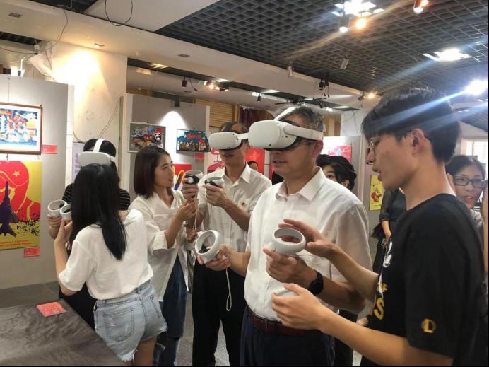 在展会现场。校领导们现场体验了VR 虚拟技术,通过 VR 所呈现的红船场景再现了开天辟地的时刻,该作品引入了多元化的创新思维,与时俱进,成功地将红船精神通过创新科技展现出来,让每位参与者感受沉浸式的交互体验。