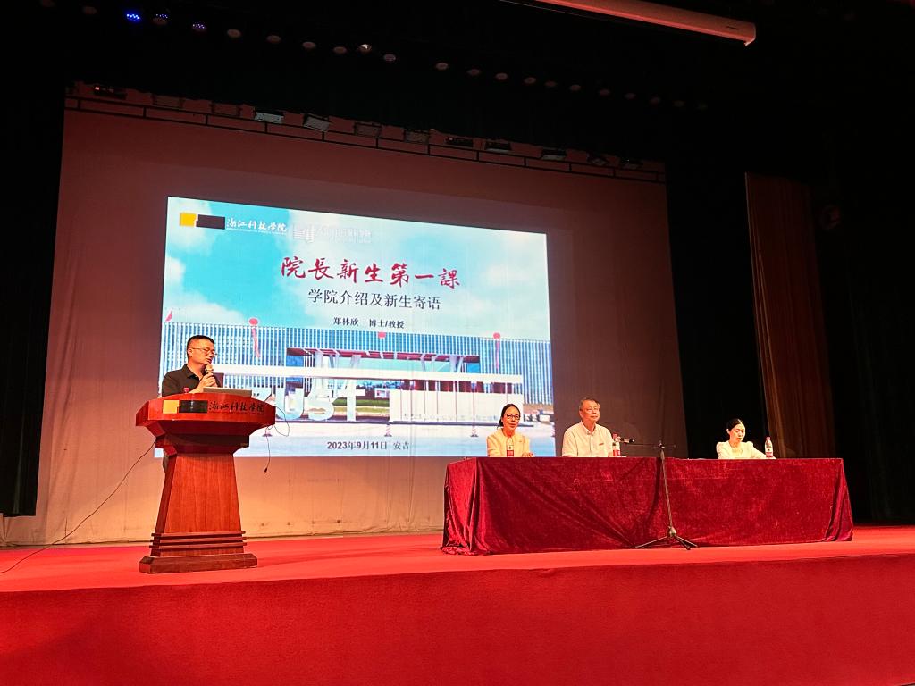 于9月11日晚在安吉校区隆重举行了“2023级新生开学典礼暨专业介绍大会”。学院党委书记詹俊、院长郑林欣、副院长俞晓群、副院长宋眉、全体系主任、教务办主任与学工办负责人、新生班主任代表、辅导员以及全体2023级本科新生出席典礼。