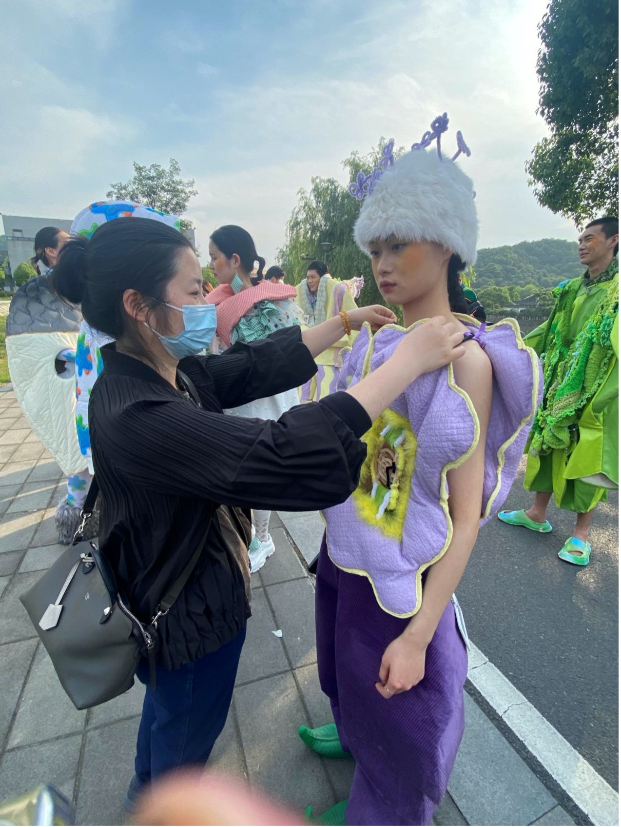 “时创美学”团队的女教师们结合自身专业及资源优势,从设计、策划、试装、后台、妆面造型、视频各方面严格把控,亲力亲为,从教学科研和文化生活两个角度贡献出“巾帼文明岗”的力量,最终顺利完成本次视频的录制工作。